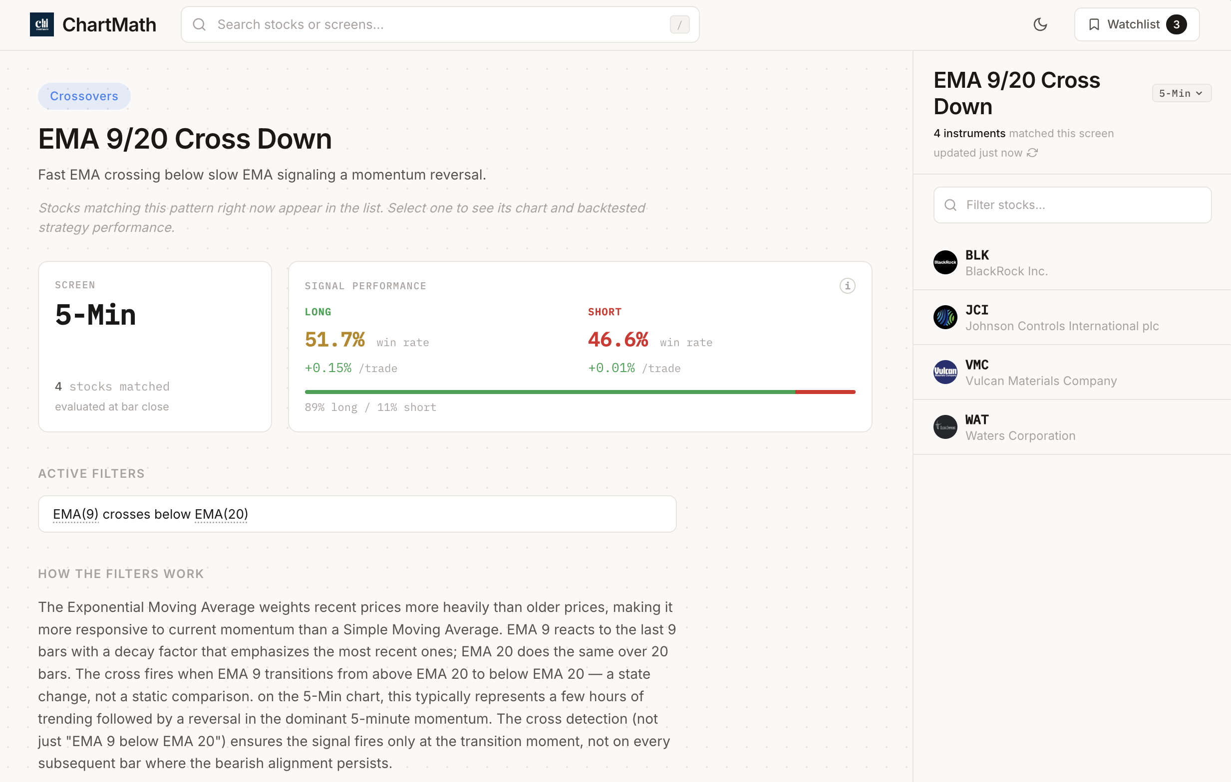 ChartMath was built specifically to solve this problem. Our platform continuously scans the market across 200+ technical screens, instantly alerting you when stocks match proven setups like ORB, VWAP touches, RVOL spikes, and all the patterns we've covered in this guide. Every alert includes backtest data showing historical win rates and expected value, so you can make informed decisions about which trades to take.